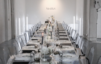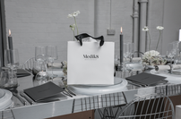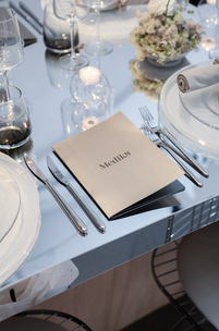 FOR THE MEDIK8 RETINAL PRODUCT LINE LAUNCH, WE CREATED A CUSTOM MIRRORED TABLE WHICH ADDED A MODERN AND CLINICAL FEEL, TOPPED WITH DELICATE GLASS PLATES DISPLAYING BESPOKE REFLECTING NAME DISCS AND SILVER ROCK NAPKIN HOLDERS. MEDIK8'S METALLIC BRANDING GRACEFULLY EMERGED ON THE TABLESCAPE, MATCHING SEAMLESSLY WITH THE PRODUCT LINE.